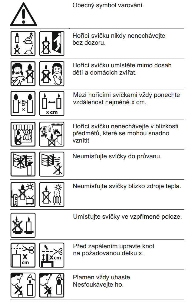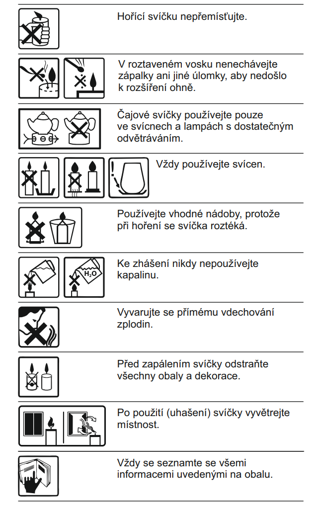 Abychom vám usnadnili bezpečné používání svíček, připravili jsme přehled nejdůležitějších bezpečnostních piktogramů a vysvětlení, co jednotlivé symboly znamenají.