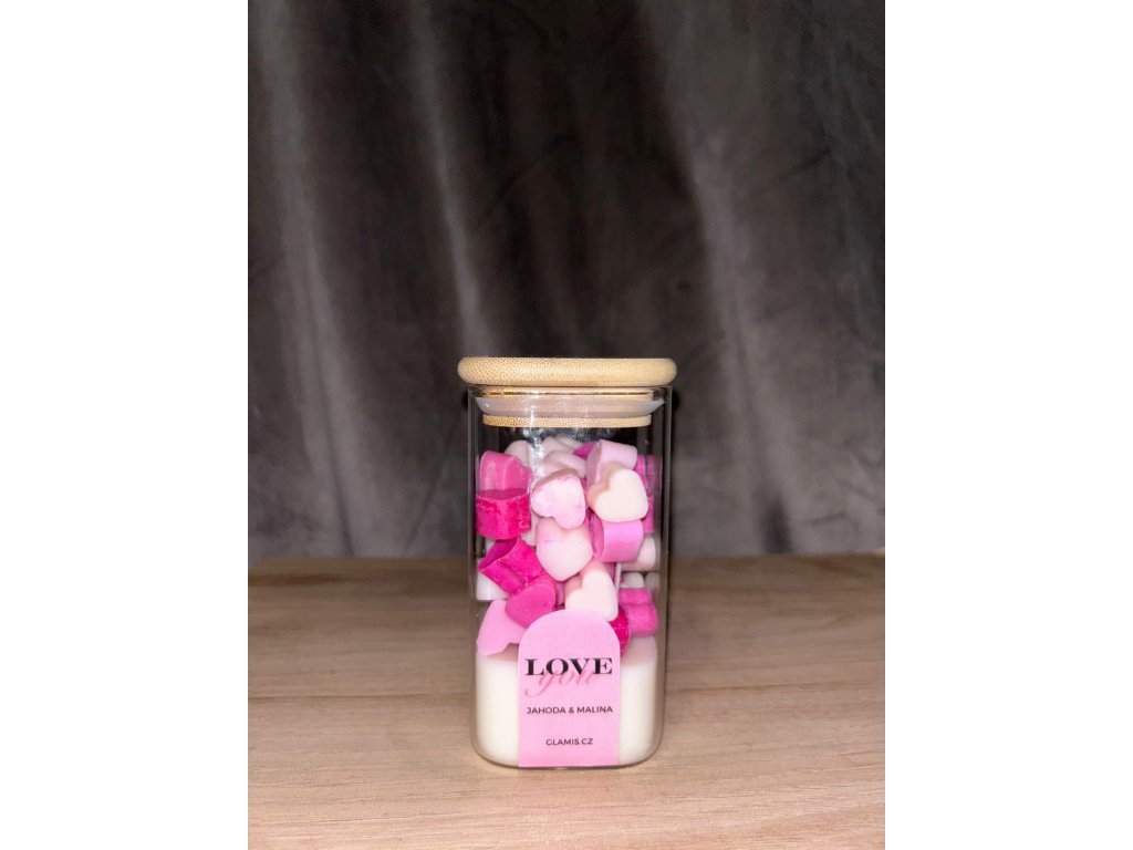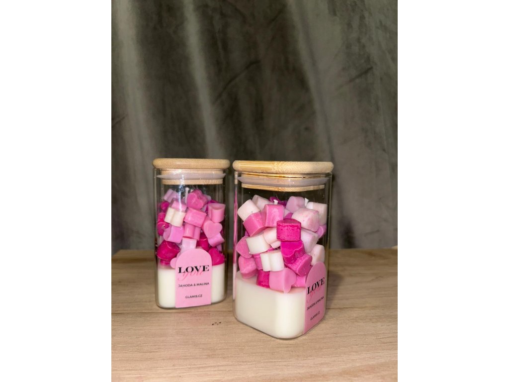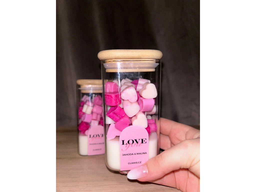 Svíčka LOVE you s vůní jahod a malin přináší sladce svěží aroma a jemný design s růžovými voskovými srdíčky. Ručně vyráběná ze sojového vosku, ideální jako dárek i stylový doplněk interiéru.