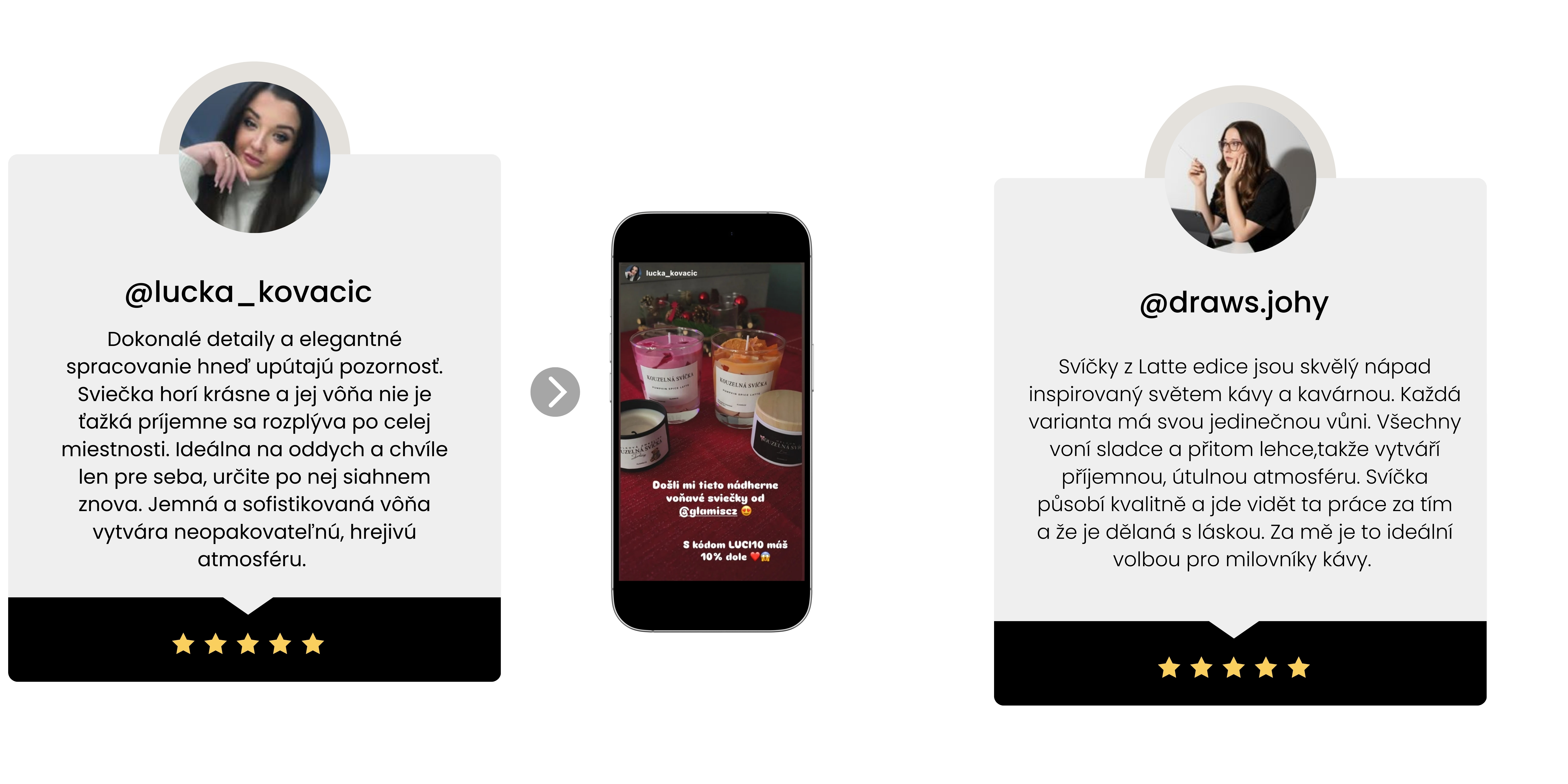 Každá svíčka je ručně odlévaná z přírodního sójového vosku, který hoří čistě, rovnoměrně a dlouho. Design i barvy ladí s tématem latté – jemné odstíny, minimalistický styl a vůně, které zútulní každý prostor.